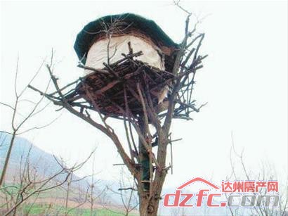 眉县汤峪镇新联村下辖的岗子庙自然村,农民杜仕升因为家里很贫困,很多年前,在自己家里一棵直径约80厘米的板栗树上,以木板、荆笆、塑料薄膜、铁皮和油毡为原料做了树屋。树屋就建在其自家的果园边,离地有五六米高,但不是为了看管果园,就是为了住人。就这么住了20多年,因为常年全家都在外面打工,其实住的时间并不多,每年收秋粮和收夏粮的时候回来住一个月,平时就在外面。今年3月,有陕西媒体报道了这件事。“空中屋”一时成为远近闻名的“景点”,不少到秦岭旅游者慕名前去观看。“前几个月当地有关部门就悄悄把这树屋给拆掉了。”网友“建设性”说,这大概是觉得影响了形象。“其实我觉得这作为一个景点挺好的。”